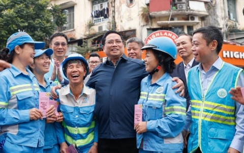 Thủ tướng lì xì, chụp ảnh cùng công nhân vệ sinh môi trường trên phố