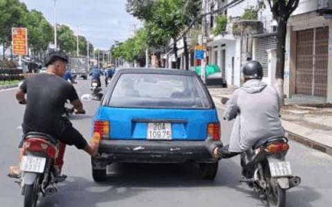Cảnh sát xác minh clip 2 người đi xe máy dùng chân đẩy ô tô chạy trên đường