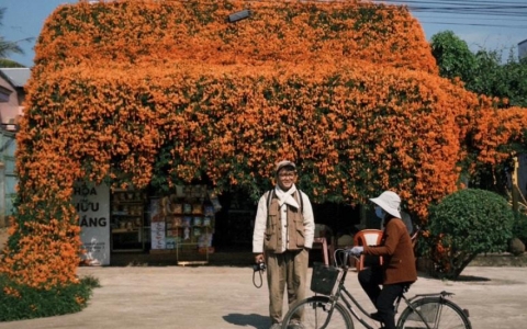 Giàn hoa xác pháo được gia đình anh Phi Long trồng từ năm 2009. Mỗi năm cây ra hoa 2 lần với những tán hoa xòe rộng như rèm che. Màu hoa rực rỡ thu hút du...