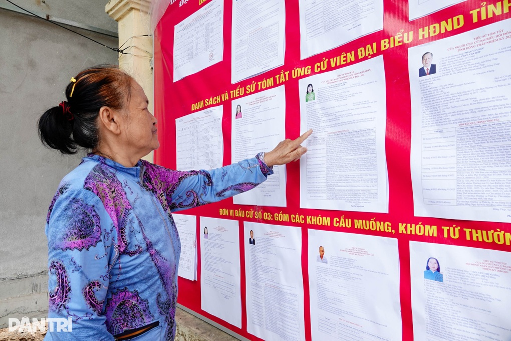 Bà Trần Thị Màu (60 tuổi, ngụ khóm Cầu Muống) đọc danh sách ứng cử viên (Ảnh: Bảo Kỳ).