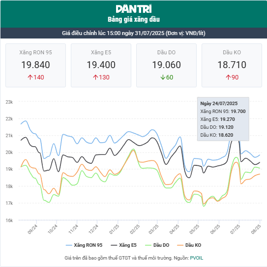 Ở lần điều chỉnh gần nhất ngày 31/7, xăng E5 RON 92 giảm 130 đồng/lít lên 19.400 đồng/lít; xăng RON 95 cũng tăng 140 đồng/lít, lên 19.840 đồng/lít. Dầu diesel giảm 60 đồng/lít còn 19.060 đồng/lít, dầu hỏa tăng 90 đồng/lít lên 18.710 đồng/lít; dầu mazut tăng 160 đồng/kg lên mức 15.530 đồng/kg.