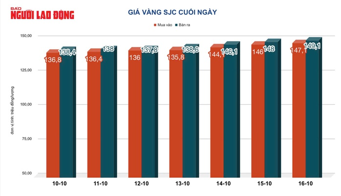 Tại Việt Nam, giá vàng miếng SJC cuối ngày 16-10 được các doanh nghiệp bán ra 149,1 triệu đồng/lượng, giá vàng nhẫn bán ra lên tới 148,1 triệu đồng/lượng.