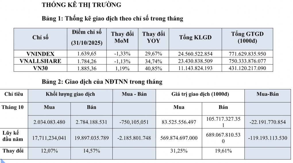 Về giao dịch của nhà đầu tư nước ngoài, tổng giá trị giao dịch của nhà đầu tư nước ngoài trong tháng 10 đạt trên 189.242 tỷ đồng, chiếm 12,26% tổng giá trị giao dịch của toàn thị trường. Nhà đầu tư nước ngoài đã thực hiện bán ròng trong tháng với giá trị hơn 22.191 tỷ đồng.