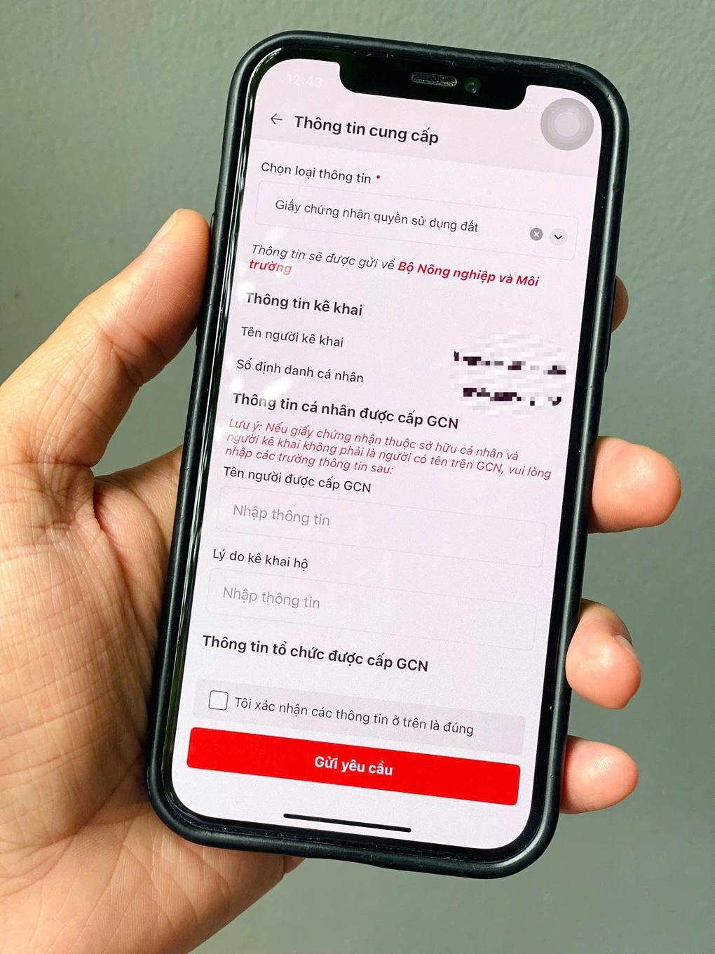 Trong phần kê khai, người dùng cần điền họ tên và số định danh cá nhân. Nếu kê khai thay cho người khác, phải nhập thêm tên người được cấp sổ đỏ và lý do kê khai hộ.