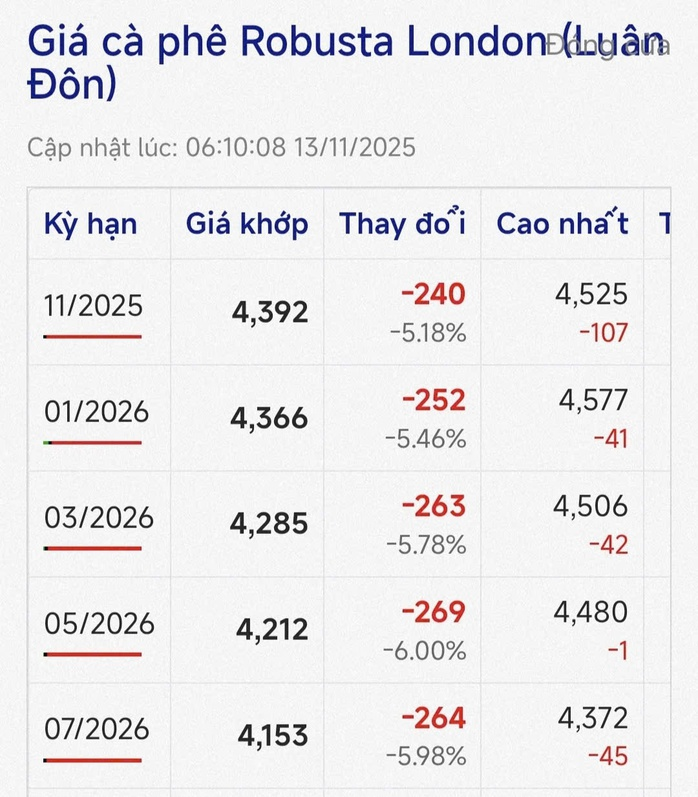 Tuy nhiên, đây vẫn chưa là kỳ hạn giá giảm mạnh nhất. Robusta giao tháng 5-2026 giảm đến 269 USD/tấn, tương đương 6%, còn 4.212 USD/tấn; Arabica giao tháng 5-2026 giảm đến 500 USD/tấn, còn 7.950 USD/tấn.