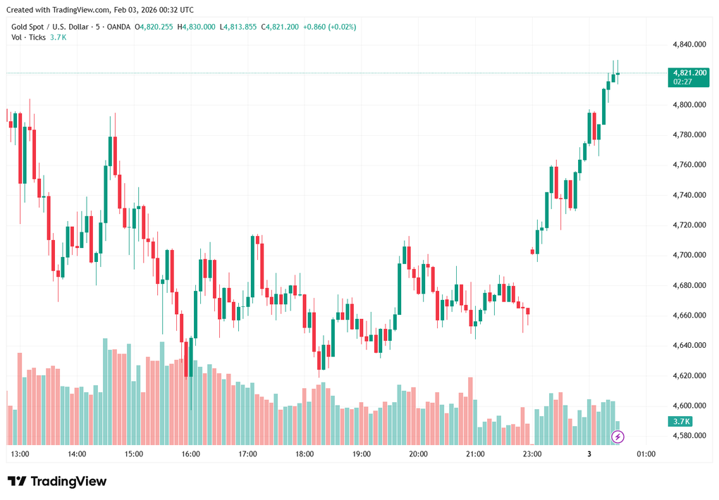Ghi nhận lúc 16h ngày 2/2 (giờ Việt Nam), giá vàng thế giới giao ngay còn đang chật vật dò đáy quanh mốc 4.620 USD/ounce, dư âm của áp lực bán tháo ồ ạt từ cuối tuần trước. Tuy nhiên, chỉ trong chưa đầy 12 tiếng đồng hồ, một lực cầu bắt đáy khổng lồ đã xuất hiện, đẩy kim loại quý này bay thẳng lên mốc 4.821 USD/ounce vào lúc 7h00 sáng nay (3/2).