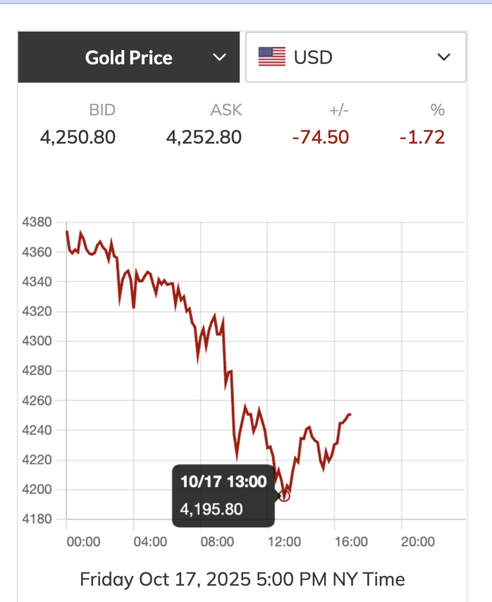 Mốc thấp nhất của giá vàng thế giới thủng 4.200 USD/ounce, tức là mất khoảng 180 USD/ounce so với mức đỉnh lịch sử