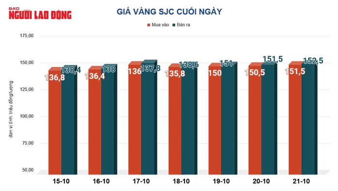 Tại Việt Nam, giá vàng miếng SJC cuối ngày 21-10 tại các doanh nghiệp cũng lên tới 152,5 triệu đồng/lượng, giá vàng nhẫn 151,5 triệu đồng/lượng.