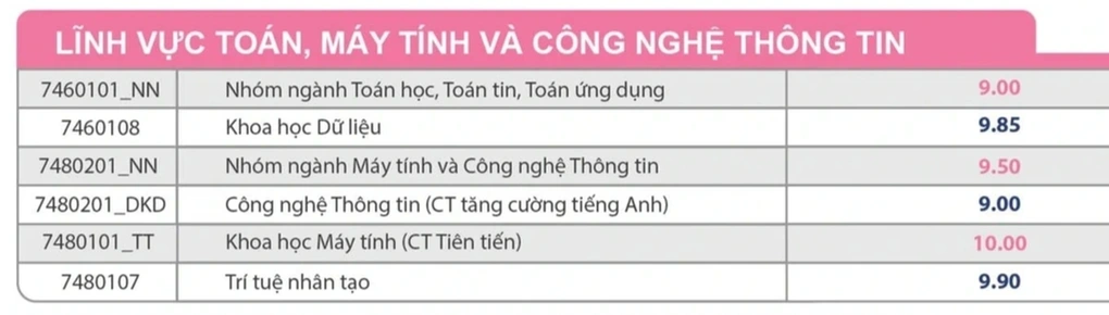 Tại trường này, ở phương thức xét tuyển theo quy định của Đại học Quốc gia TPHCM, ngành khoa học máy tính có điểm chuẩn ở mức tuyệt đối 10/10. Tiếp đến là ngành trí tuệ nhân tạo 9,9 điểm, ngành khoa học dữ liệu 9,85.
