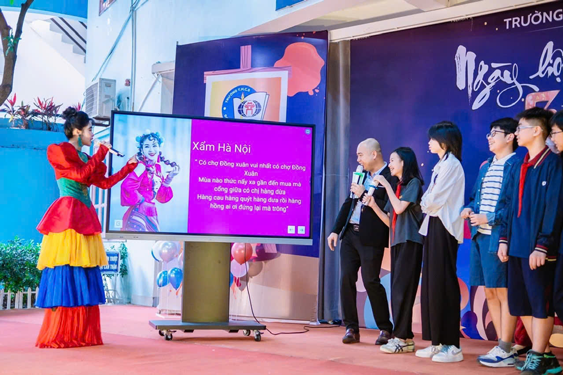 Nghệ sĩ tham gia một hoạt động giới thiệu về hát xẩm tại một trường học tại Hà Nội