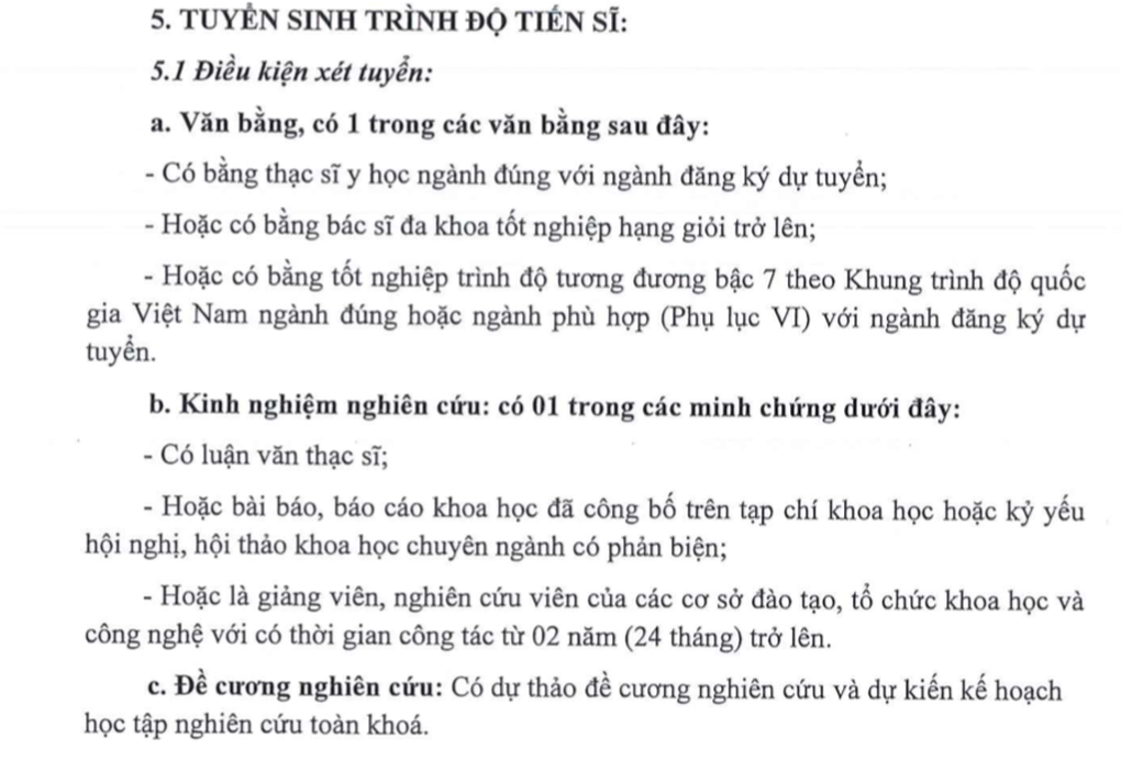 Còn theo thông báo số 137 về tuyển sinh sau đại học của Trường Đại học Y khoa Phạm Ngọc Thạch, đối với tuyển sinh trình độ tiến sĩ, thí sinh phải đáp ứng các điều kiện sau: