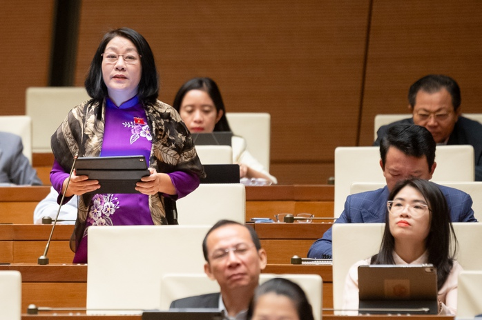 Đại biểu Nguyễn Thị Tuyết Nga (đoàn Quảng Trị): "Nhìn những gương mặt, gương mặt bơ phờ, đờ đẫn vì áp lực thi cử của những trẻ em mới 14-15 tuổi, đọc những bức thư đầy tuyệt vọng của các của trẻ em khi không vượt nỗi kì thi vào trung học phổ thông mà thầy nhói lòng". Ảnh: Phạm Thắng