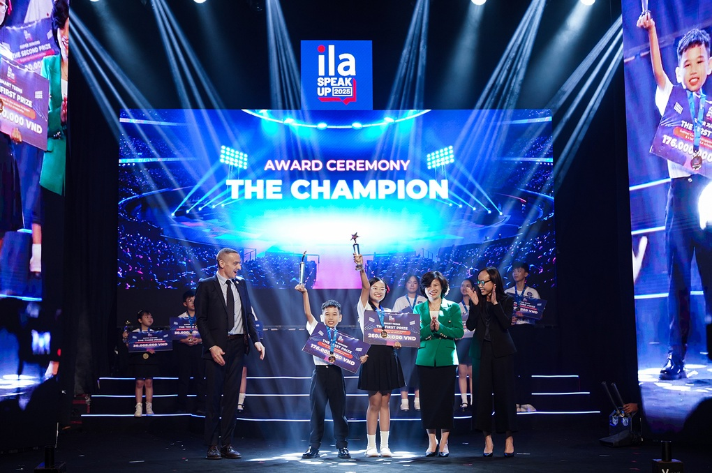 Khép lại Speak Up 2025, các thí sinh xuất sắc được trao những giải thưởng giá trị, bao gồm các chuyến du học hè quốc tế và học bổng dài hạn với tổng trị giá gần 1 tỷ đồng. Quán quân bảng Super Juniors năm nay thuộc về em Lê Quang Phúc (8 tuổi, ILA Vũng Tàu). Bảng Smart Teens gọi tên em Nguyễn Khánh Hân (12 tuổi, ILA Phan Văn Trị, TPHCM).