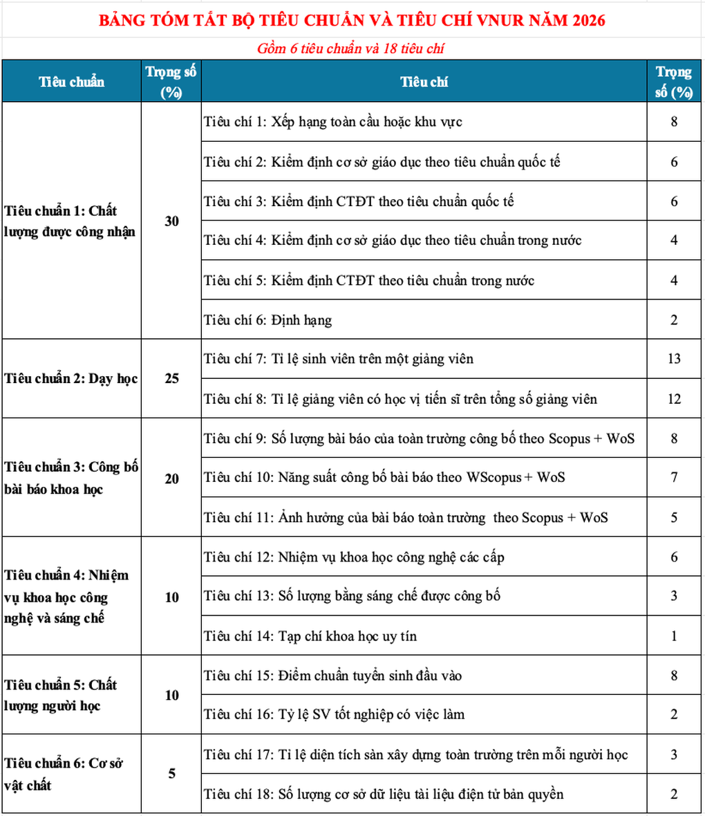 Bảng tóm tắt bộ tiêu chuẩn và tiêu chí xếp hạng đại học VNUR năm 2026 (Nguồn: Nhóm thực hiện).