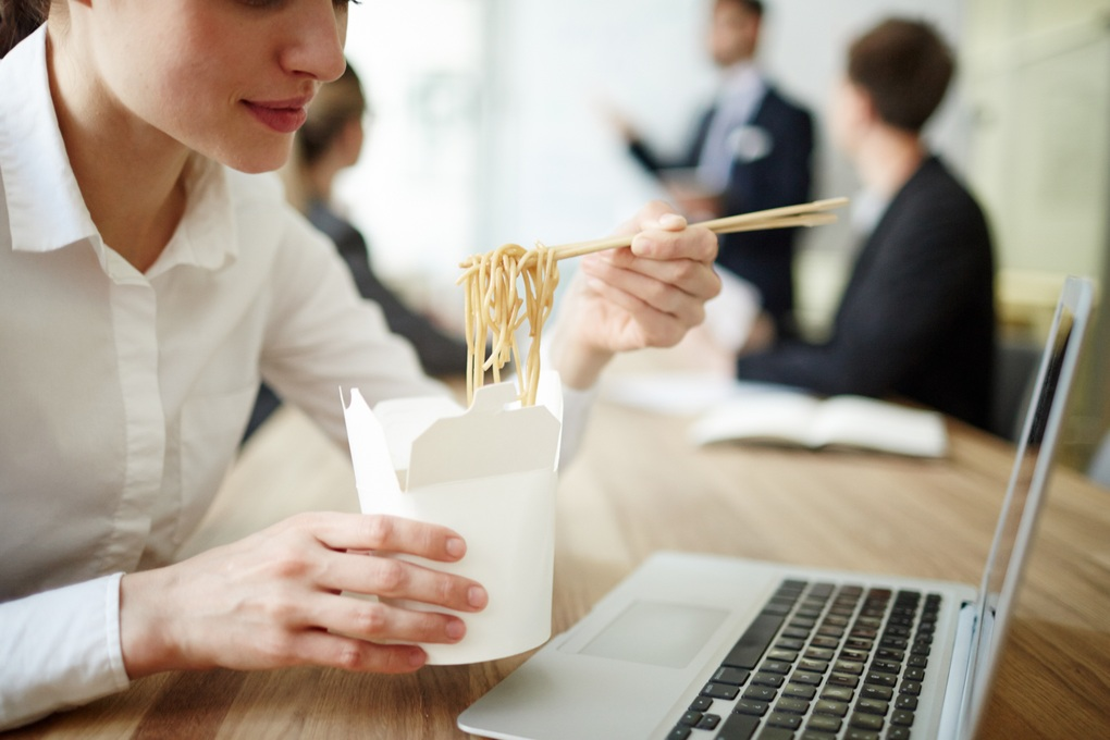 Những bữa ăn vội trên bàn làm việc là thói quen phổ biến của nhiều người trẻ hiện nay (Ảnh: Freepik).