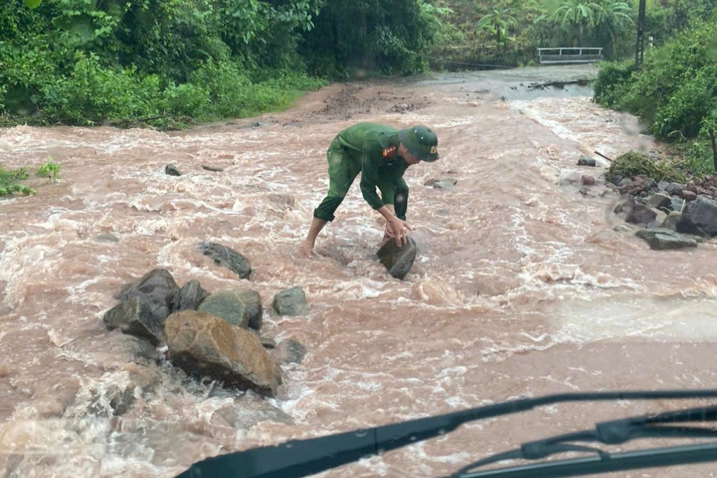 Các cán bộ công an luân phiên nhau khiêng đá bị nước cuốn nằm đầy mặt đường để xe di chuyển thuận lợi. Với tinh thần trách nhiệm cao, các cán bộ công an xã đã đưa 2 sản phụ đến trung tâm y tế an toàn.