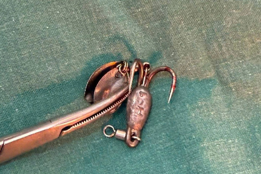Qua kiểm tra, bác sĩ nhận thấy lưỡi câu cắm sâu vào phần mô mềm, đe dọa các cấu trúc quan trọng như mạch máu và dây thần kinh. Vị trí vết thương nguy hiểm, tiềm ẩn nhiều nguy cơ ảnh hưởng đến sức khỏe, tính mạng.