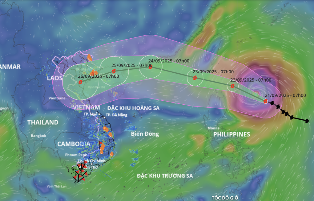 Dự báo ngày 23/9 bão Ragasa sẽ đi vào Biển Đông với sức gió mạnh nhất vùng gần tâm bão cấp 16-17 (cấp siêu bão). Sau đó bão di chuyển chủ yếu theo hướng Tây Tây Nam và suy yếu dần.