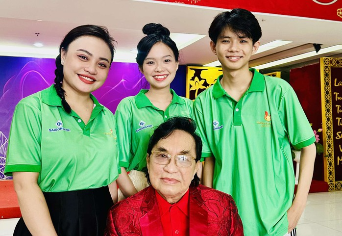 Từ trái sang: Thùy Dương, Hà Như và Quan Trí chụp ảnh lưu niệm với NSND Thanh Tuấn