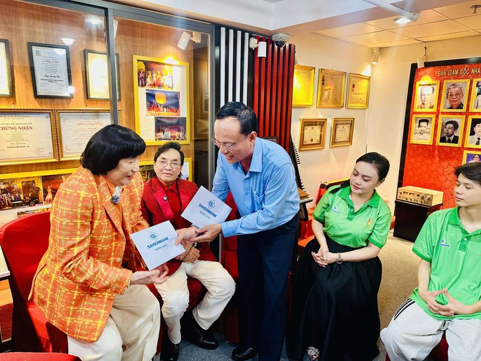 Ông Trần Thanh Giang – thành viên Hội đồng quản trị, Tổng giám đốc SaiGonBank trao tặng quà cho hai NSND - cảm ơn sự đồng hành của hai NSND đối với hành trình 20 năm của "Chuông vàng vọng cổ".