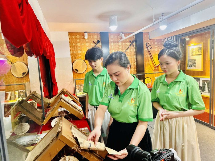 Ba thí sinh xem lại những kịch bản xưa tại Phòng truyền thống Nhà hát Trần Hữu Trang