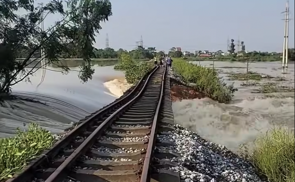 Nước lũ đổ về cuồn cuộn đã cuốn trôi khoảng 50m nền đường sắt Hà Nội - Thái Nguyên ở địa phận xã Trung Giã, Hà Nội, khiến hoạt động vận tải bằng xe lửa bị ảnh hưởng, gián đoạn (Ảnh: Nguyễn Ngọc Thao).