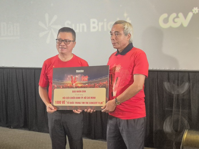 Nhà báo Lê Quốc Minh - Ủy viên Trung ương Đảng, Tổng Biên tập Báo Nhân Dân, Phó Trưởng Ban Tuyên giáo và Dân vận Trung ương, Chủ tịch Hội Nhà báo Việt Nam (trái) - đã trao tặng 1.000 vé xem phim cho Hội cựu chiến binh.