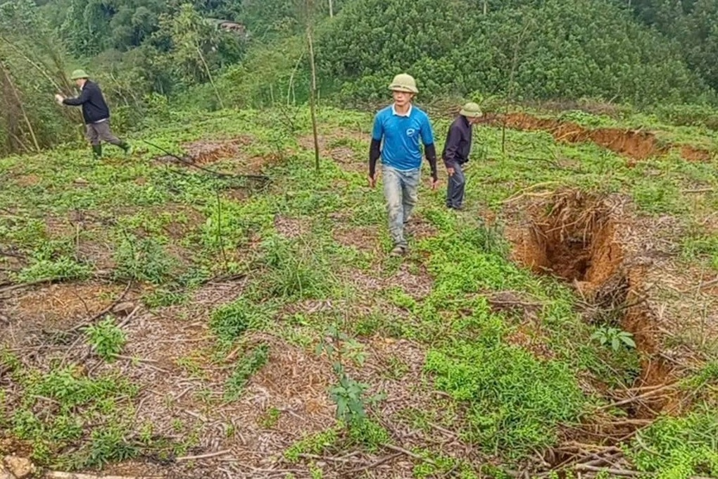 Đồi cao khoảng 50m bị nứt, sụt lún sâu 80cm, có điểm tới 1m, tạo thành rãnh chạy dọc sườn.