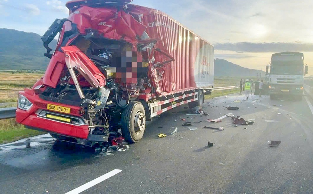 Xe tải lưu thông trên cao tốc Vĩnh Hảo - Phan Thiết bất ngờ tông vào đuôi ô tô chạy cùng chiều phía trước khiến đầu xe biến dạng, tài xế bị thương, kẹt trong cabin.