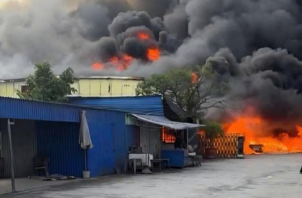 Theo quan sát, lửa bùng phát dữ dội từ xưởng giày da kèm theo khói đen cuồn cuộn, bốc cao hàng chục mét.