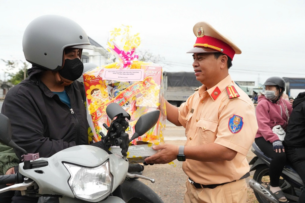 Tại điểm hỗ trợ trên quốc lộ 1A, xã Hàm Kiệm, tỉnh Lâm Đồng, trong ngày 11/2, Đội cảnh sát giao thông đường bộ số 3, Phòng cảnh sát giao thông Công an tỉnh đã trao quà, lì xì đến người dân đi xe máy từ các tỉnh phía Nam về miền Trung, miền Bắc đón Tết.