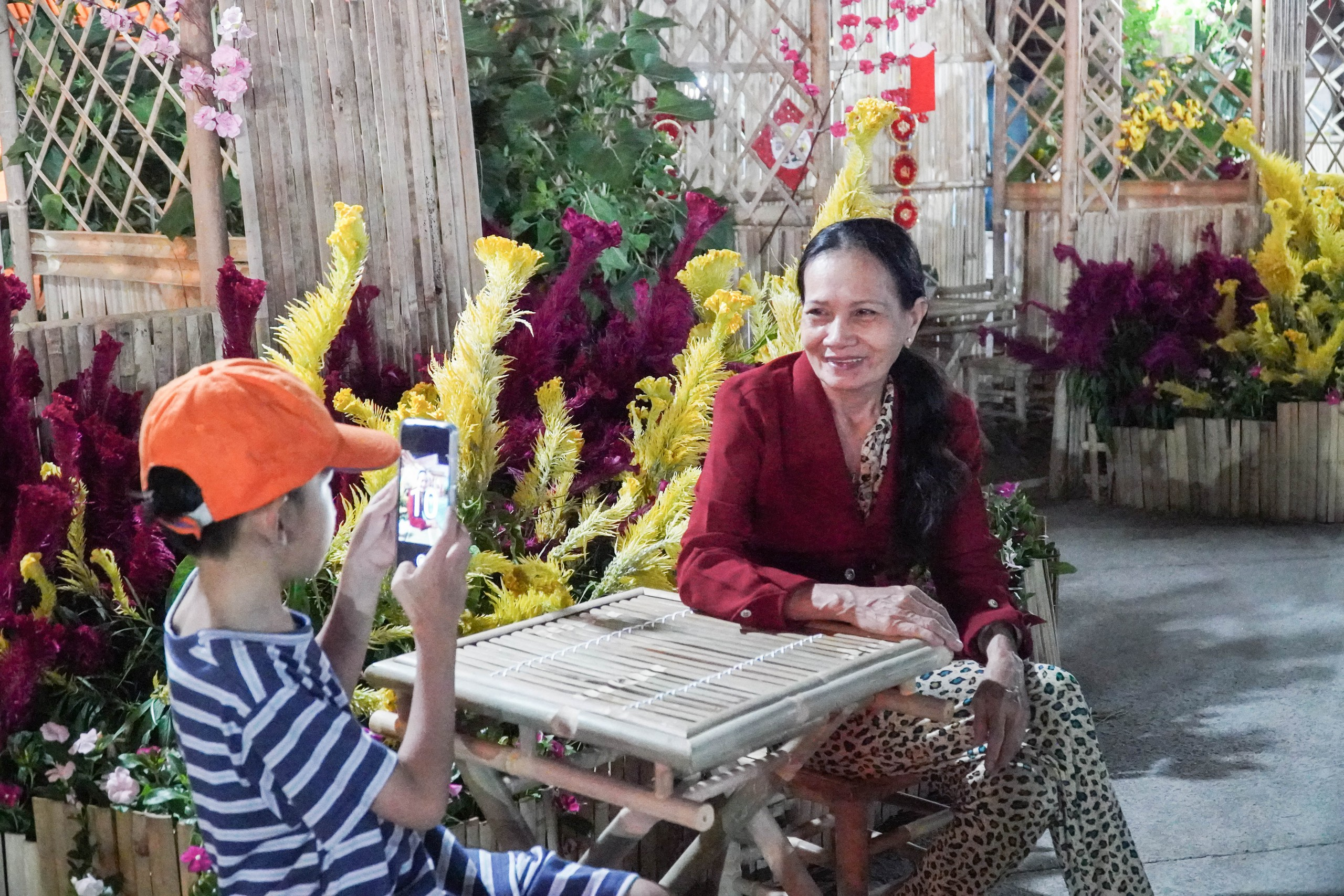 Bà Minh Tâm và cháu trai chụp ảnh tại Hội hoa xuân xã Đông Thạnh