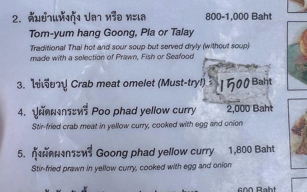Giá niêm yết trong thực đơn là 1.500 baht, nhưng vị khách bị tính giá 4.000 baht cho món ăn này (Ảnh: Bangkok).