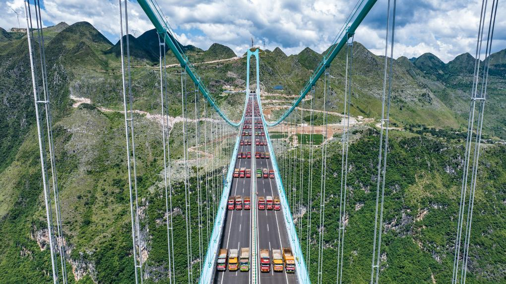 Ngày 25/8, một đoàn xe tải gồm 96 xe, tổng trọng lượng nặng 3.360 tấn đã chạy dọc theo cầu hẻm núi Hoa Giang thuộc tỉnh Quý Châu (Trung Quốc) - cây cầu tương lai trở thành cầu cao nhất thế giới.