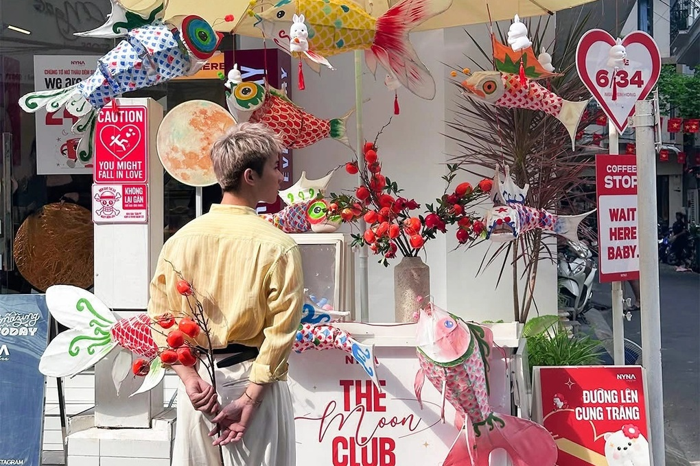 Mùa Trung thu, quán khoác lên mình sắc màu rực rỡ với đèn lồng, cá chép giấy và các chi tiết trang trí, biến mọi góc thành điểm sống ảo lý tưởng (Ảnh: Facebook Ban Công).
