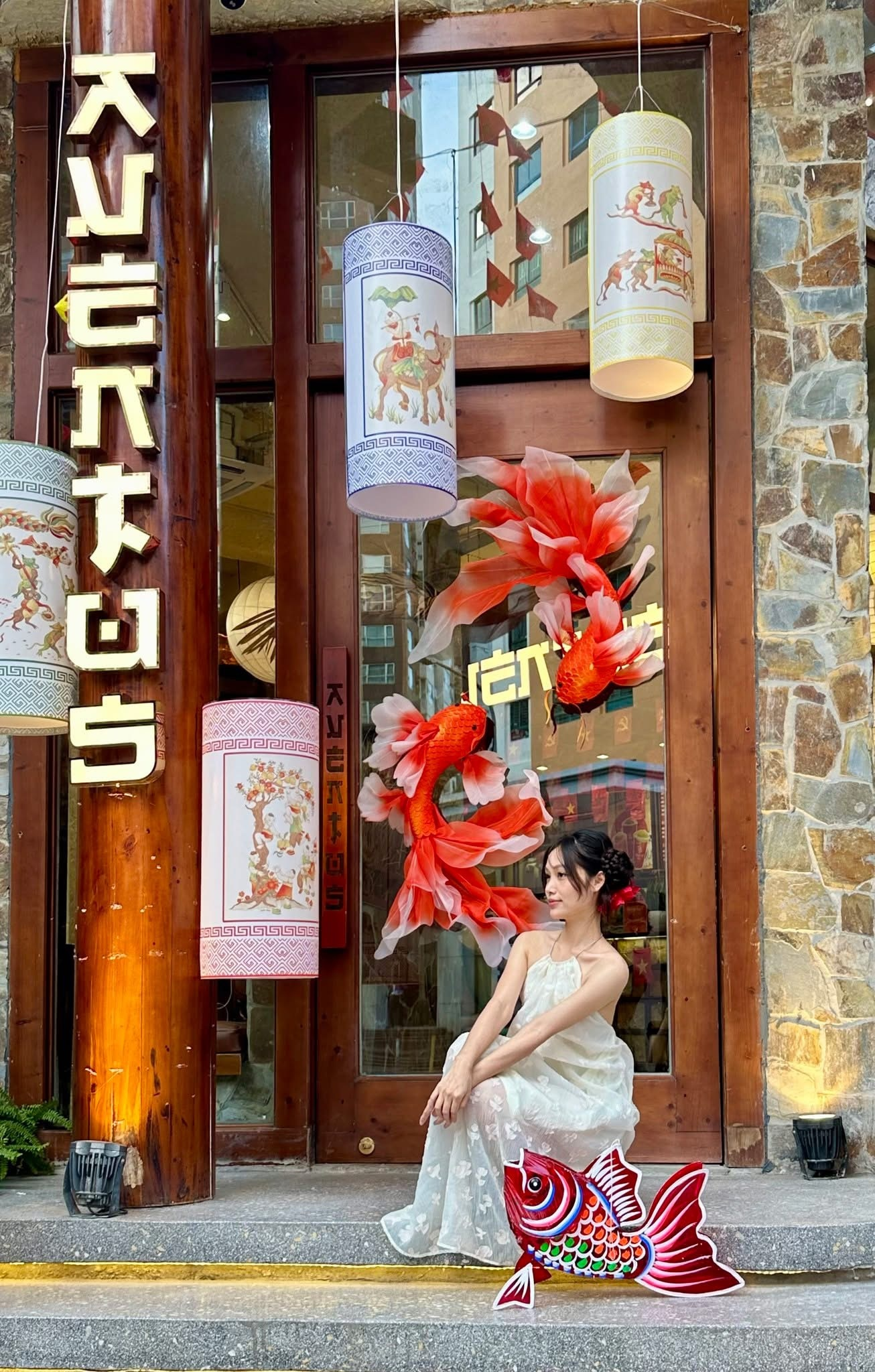 Mặt tiền quán được điểm xuyết giàn cây leo mềm mại, mang hơi hướng cổ tích. Không gian trong nhà lẫn ngoài trời đều có nhiều góc check-in sinh động, từ đèn lồng, cá chép giấy đến trăng lưỡi liềm, tạo nên khung cảnh vừa ấm áp vừa rực rỡ.