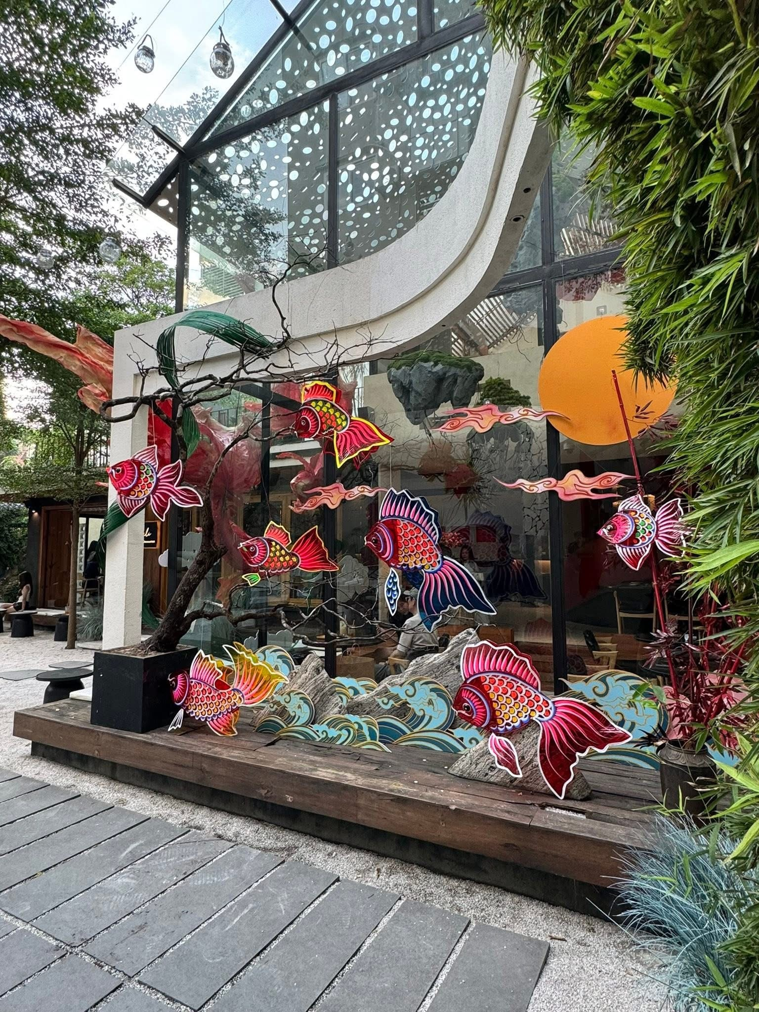 Mặt tiền quán được trang trí đậm tinh thần Trung thu, nổi bật với chú cá chép giấy màu đỏ trên nền gỗ (Ảnh: Aventus Coffee).
