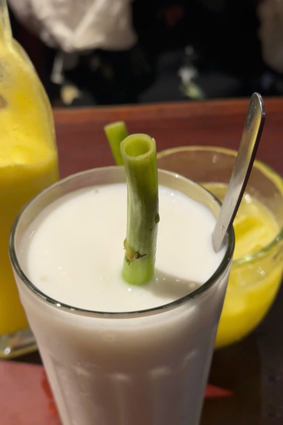 Khi gọi đồ uống, cô gái bất ngờ khi thấy nhân viên phục vụ mang ra ly nước với cọng rau muống cắm phía trên, dùng thay cho ống hút thông thường. Cách làm này khiến cô sửng sốt.