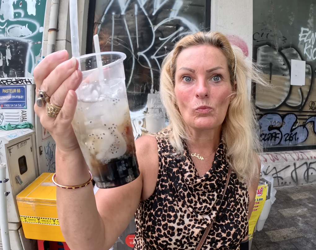 Nữ du khách thích thú với món chè sương sáo hạt chia giá chỉ 17.000 đồng ở TPHCM (Ảnh: Chụp màn hình).