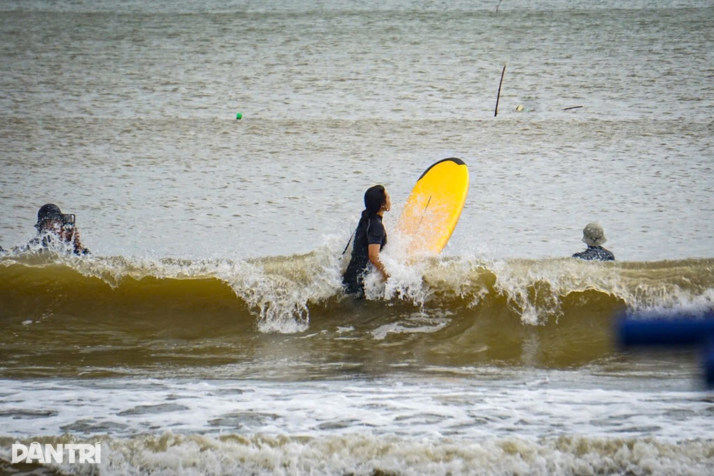 Trong khi đó, trời chưa có gió và mưa lớn nên du khách vẫn giữ thói quen ra biển để dạo chơi, tập thể dục. Một số du khách nước ngoài còn lướt ván khi cho rằng đây là mức sóng biển phù hợp để trải nghiệm môn thể thao này.