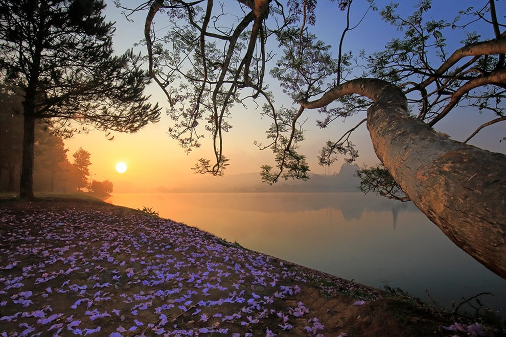 Nhiếp ảnh gia cho biết, có năm khi mùa hoa mai anh đào vừa tàn, phượng tím bắt đầu nở rộ. Màu tím của hoa vừa dịu dàng, lại lãng mạn, tạo nên điểm nhấn đặc biệt của trời xuân Đà Lạt.