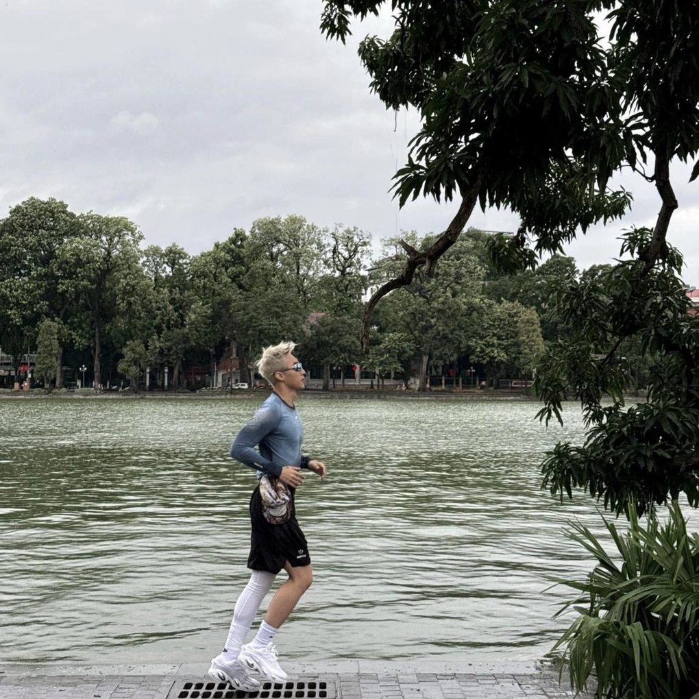 Nam ca sĩ trong bộ đồ thể thao khỏe khoắn, giữ lời hứa với người hâm mộ tới Hồ Gươm chạy bộ (Ảnh: Sơn Tùng M-TP).