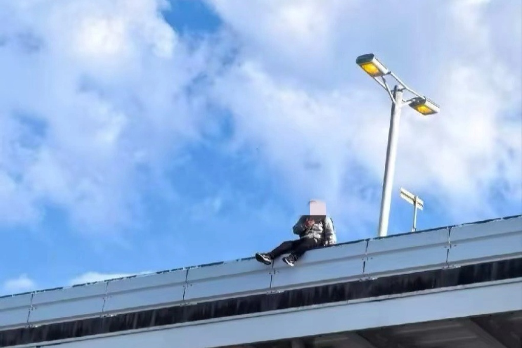 Du khách ngồi vắt vẻo bên ngoài lan can của nhà ga sân bay (Ảnh: Xiaohongshu).
