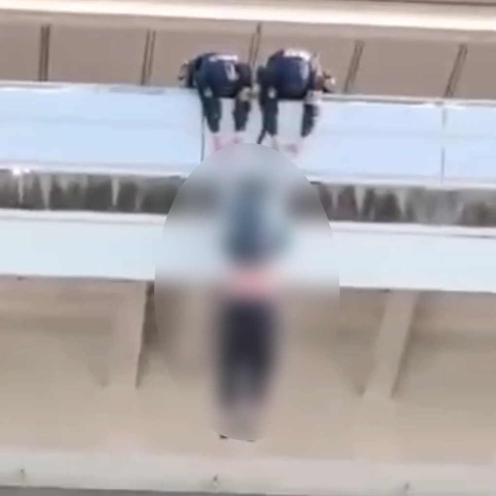 Các cảnh sát tóm chặt tay của du khách trẻ, nhưng không thể giữ quá lâu và nạn nhân rơi xuống đất (Ảnh: Xiaohongshu).