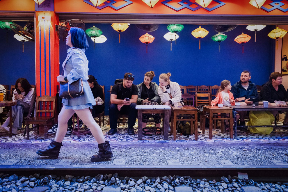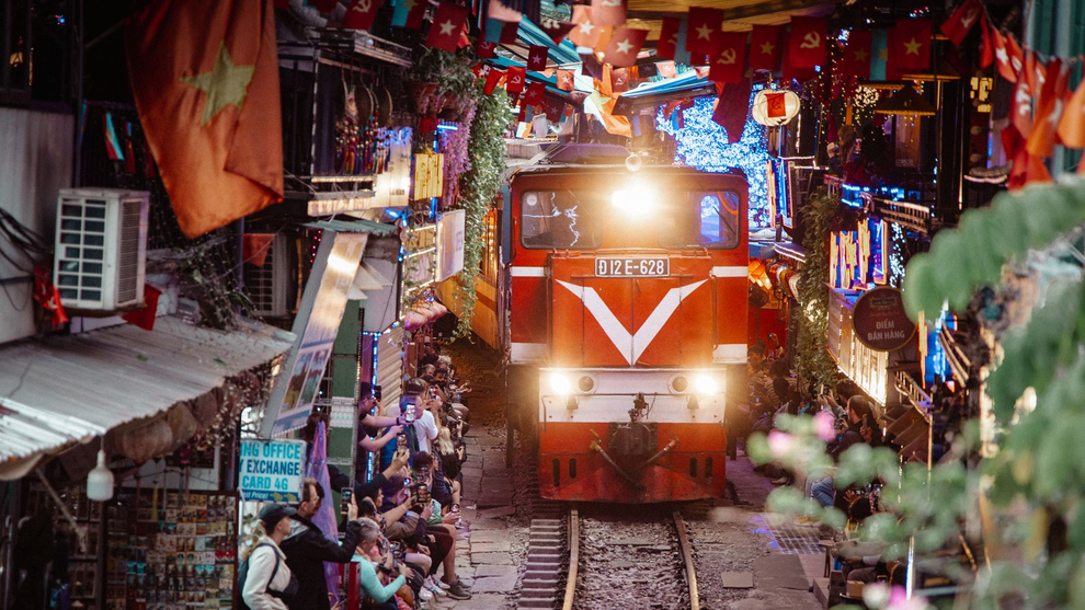 Con tàu lao tới, gần đến mức khiến người ta có cảm giác chỉ cần duỗi tay ra là chạm vào thân tàu nếu ai đó đủ liều lĩnh để thử. Tiếng còi vang dội giữa những quán cà phê chen chúc trong con ngõ chỉ rộng hơn đầu tàu một chút.