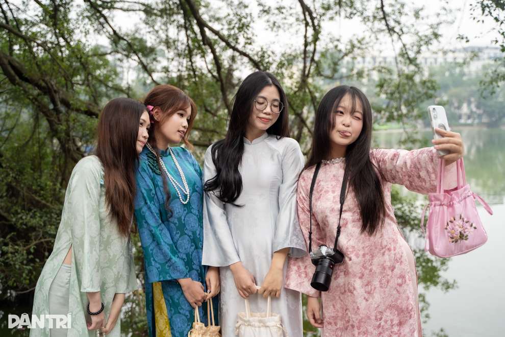 Các thiếu nữ chụp ảnh với áo dài ở hồ Hoàn Kiếm (Ảnh: Đỗ Ngọc Lưu).