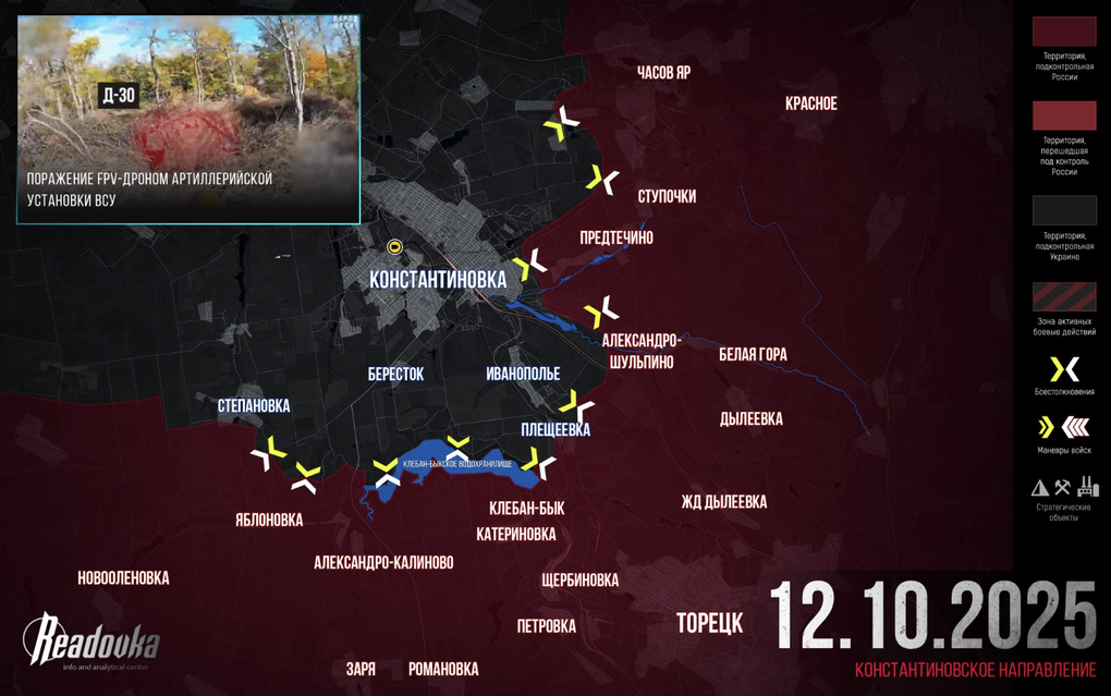 Bản đồ chiến sự Nga - Ukraine tại Konstantinovka ngày 12/10. Moscow kiểm soát phần màu đỏ, tiếp tục mở rộng tại những khu vực màu đỏ. Kiev nỗ lực chống đỡ theo các mũi tên vàng. Trong đó, thành phố Toretsk nằm ở góc dưới bên phải và hồ Kleban-Byk có màu xanh dương (Ảnh: Readovka).