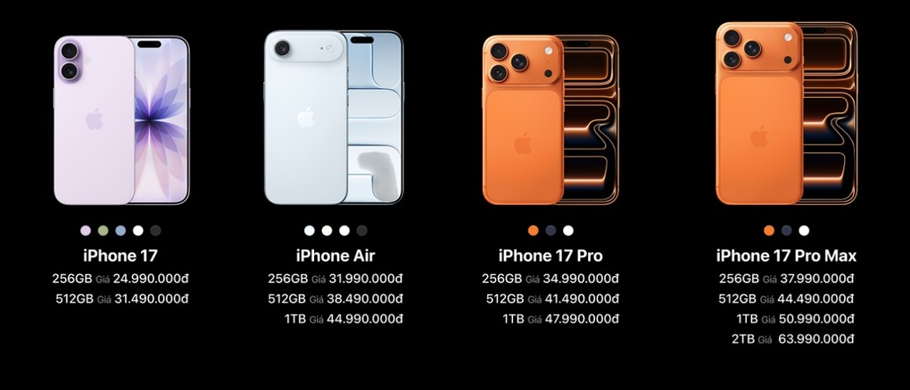 Bộ đôi iPhone 17 Pro và iPhone 17 Pro Max có giá khởi điểm từ 35 triệu đồng và 38 triệu đồng. Năm nay, iPhone 17 Pro Max cũng lần đầu tiên có phiên bản bộ nhớ 2TB với mức giá 64 triệu đồng. Đây cũng là giá bán cao nhất mà Apple từng thiết lập cho một chiếc iPhone.