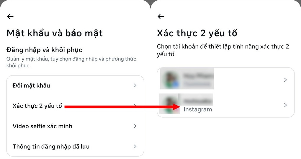 - Tại giao diện tiếp theo, chọn “Xác thực 2 yếu tố”, chọn tiếp tài khoản Instagram từ danh sách hiện ra.