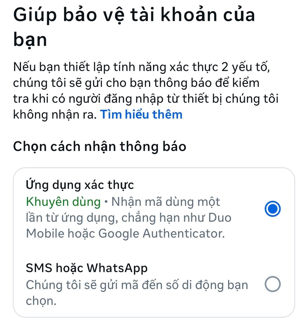 - Tại mục “Chọn cách nhận thông báo”, bạn chọn “Ứng dụng xác thực” để nhận mã bảo mật thông qua ứng dụng Google Authenticator” hoặc chọn “SMS hoặc WhatsApp” nếu muốn nhận mã xác thực qua tin nhắn gửi đến số điện thoại hoặc ứng dụng WhatsApp.